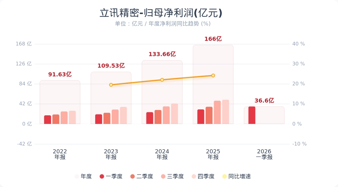 财联社4月28日电,立讯精密(002475.SZ)公告称,2026年第一季度实现营业收入838.88亿元,同比增长35.77%;归属于上市公司股东的净利润为36.60亿元,同比增长20.24%。小财注:公司Q1净利润36.6亿,2025年Q4净利润50.81亿,据此计算,Q1净利润环比下降27%。