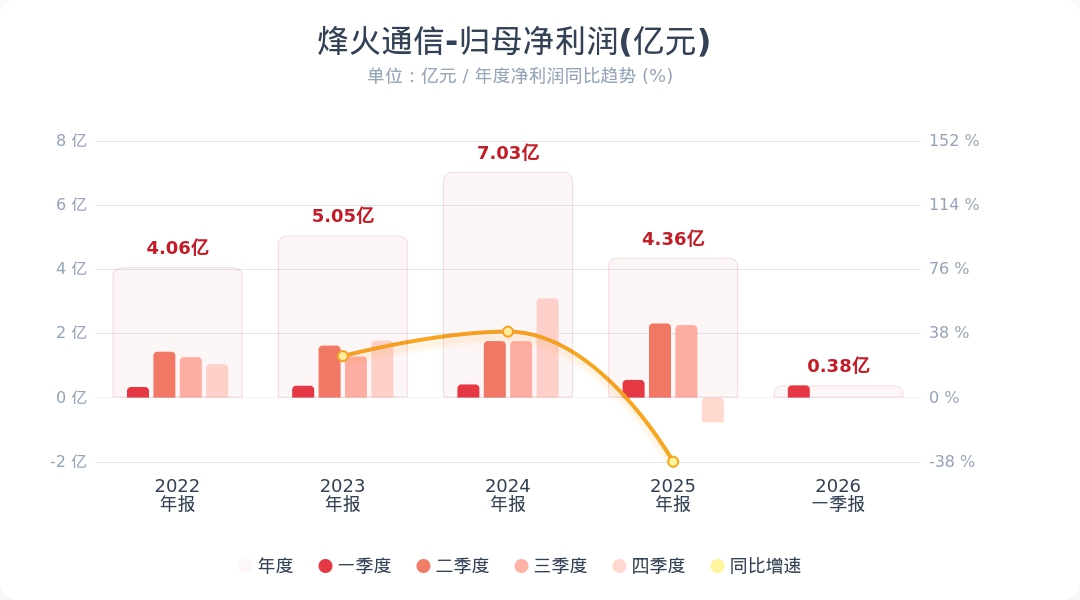 财联社4月29日电,烽火通信(600498.SH)公告称,2026年第一季度实现营业收入45.10亿元,同比增长11.40%;归属于上市公司股东的净利润为3839.25万元,同比下降30.44%。业绩变动主要系本期汇率波动导致财务费用增加以及收到的政府补助同比减少所致。小财注:公司Q1净利润0.38亿,2025年Q4净利润-0.77亿,据此计算,Q1净利润环比扭亏为盈。