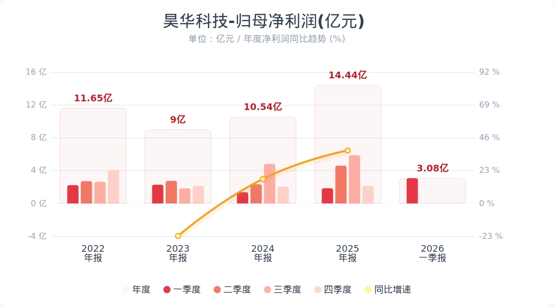 财联社4月29日电,昊华科技(600378.SH)公告称,2026年第一季度实现营业收入42.31亿元,同比增长34.02%;归属于上市公司股东的净利润为3.08亿元,同比增长66.73%。业绩变动主要系报告期内,公司氟化工业务一体化管理效能显著,在制冷剂产品市场价格维持高位运行,锂电业务市场复苏以及公司卓越运营、提质增效行动的综合作用下,公司收入和利润较上年同期有较大幅度提升。小财注:公司Q1净利润3.08亿,2025年Q4净利润2.13亿,据此计算,Q1净利润环比增长44%。