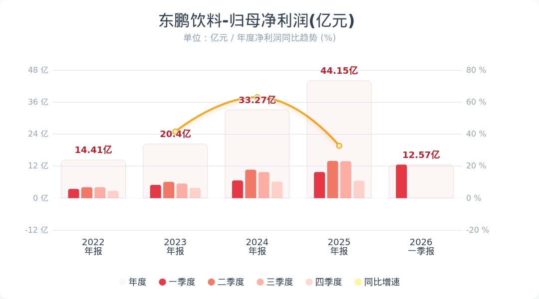 财联社4月29日电,东鹏饮料(605499.SH)公告称,2026年第一季度实现营业收入58.88亿元,同比增长21.46%;归属于上市公司股东的净利润为12.57亿元,同比增长28.31%。业绩变动主要系公司销售规模继续保持增长,营业收入较上年同期稳定增长。小财注:公司Q1净利润12.57亿,2025年Q4净利润6.54亿,据此计算,Q1净利润环比增长92%。