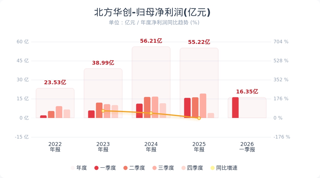 财联社4月29日电,北方华创(002371.SZ)公告称,2026年第一季度实现营业收入103.23亿元,同比增长25.80%;归属于上市公司股东的净利润为16.35亿元,同比增长3.42%。业绩变动主要系公司集成电路装备领域刻蚀、薄膜沉积、热处理、湿法清洗、离子注入、涂胶显影、键合等多款设备市占率稳步提升,工艺覆盖度及市场占有率增长,营业收入同比增加;同时公司继续积极布局多款高端半导体设备研发,持续加大研发投入,2026年1-3月计入损益的研发费用为14.02亿元,同比增长36.64%,导致归母净利增幅低于收入增幅。小财注:公司Q1净利润16.35亿,2025年Q4净利润3.92亿,据此计算,Q1净利润环比增长317%。