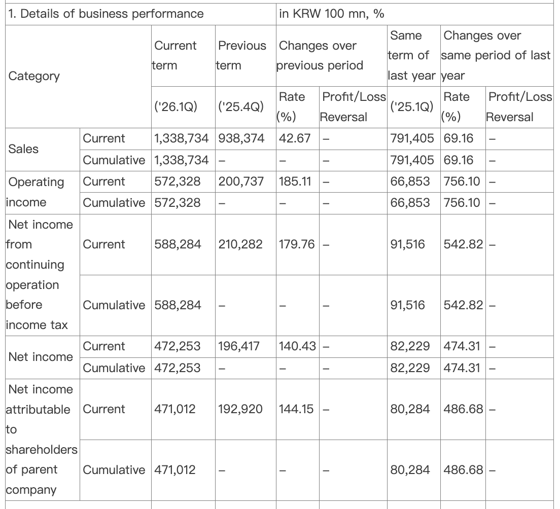 财联社4月30日电,三星电子30日披露第一季度业绩,三星电子第一季度销售额133.87万亿韩元,同比增长69.16%;营业利润57.23万亿韩元,同比增长756.10%;净利润47.10万亿韩元,同比增长486.68%,市场预估为38.29万亿韩元。