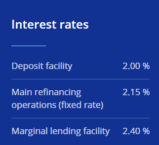 财联社4月30日电,欧洲央行将存款机制利率维持在2.00%,将主要再融资利率维持在2.15%,将边际贷款利率维持在2.40%,均符合市场预期。