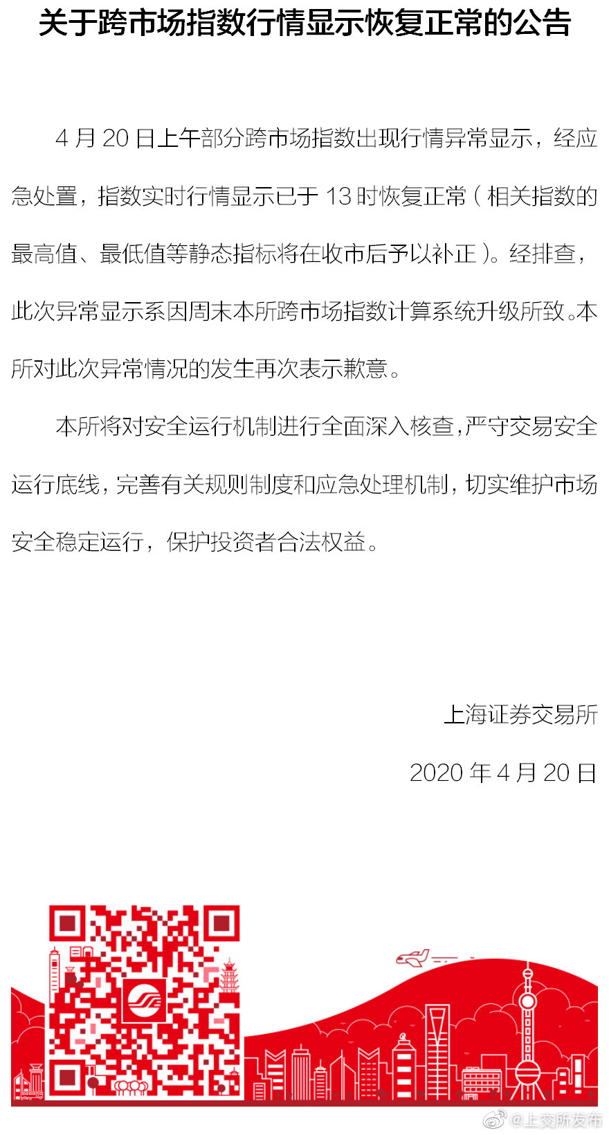 财联社4月20日讯,上交所公告,4月20日上午部分跨市场指数出现行情异常显示,经应急处置,指数实时行情显示已于13时恢复正常(相关指数的最高值、最低值等静态指标将在收市后予以补正)。经排查,此次异常显示系因周末本所跨市场指数计算系统升级所致。本所对此次异常情况的发生再次表示歉意。本所将对安全运行机制进行全面深入核查,严守交易安全运行底线,完善有关规则制度和应急处理机制,切实维护市场安全稳定运行,保护投资者合法权益。