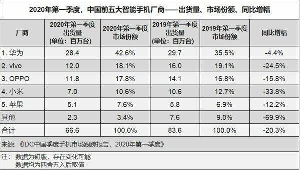 IDC:一季度中国智能手机出货量降20.3% 华为市场份额居首
