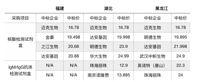 《科创板日报》11日讯,《科创板日报》记者获悉,在日前完成的福建省新型冠状病毒相关检测试剂省级集中采购中,核酸检测试剂盒由迈克生物、北京金豪制药股份有限公司、上海之江生物、达安基因四家企业中标,中标价格分别为16.78元/1人份、19.498元/1人份、20.68元/1人份和20.88元/1人份。此前,湖北省和黑龙江省已经相继完成了新型冠状病毒核酸、抗体检测试剂的带量采购,其中核酸检测试剂盒降幅均在80%左右。(记者 徐红)