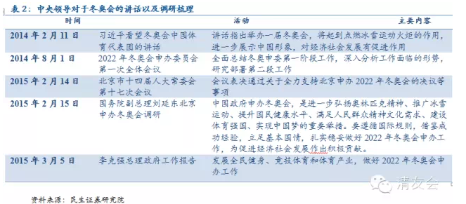 党中央对本届冬奥会屡做最高指示,值此提升软实力、推动一带一路大战略的关键时期,冬奥会的成功申办、举办关乎国家形象,我国政府对此高度重视,并将其放在至关重要的位置。并且自申办以来,国家政治局常委多次关于冬奥工作表态,发表了多次支持讲话,进行了多次实地调研。