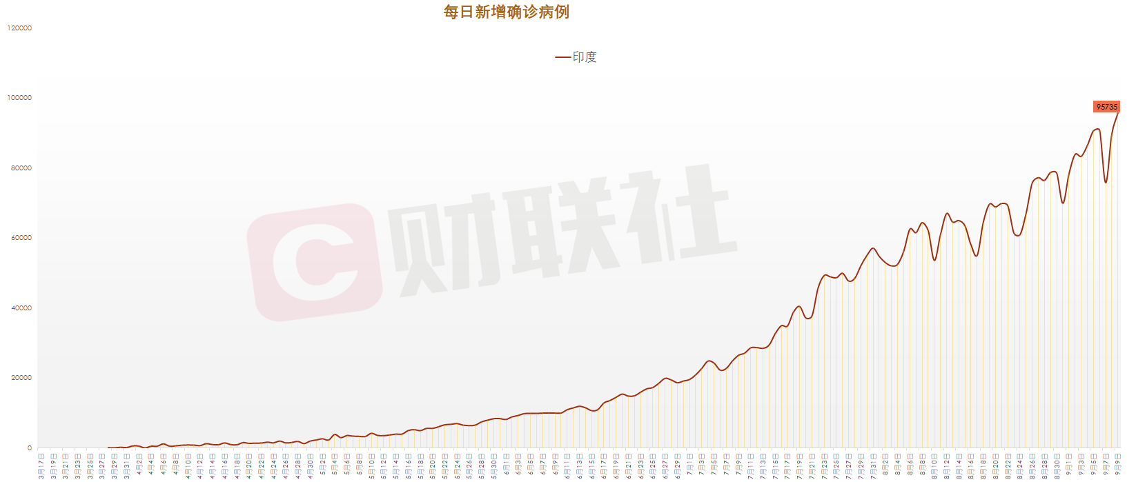 财联社9月10日讯,据印度卫生部9月9日公布的最新数据,印度新冠肺炎确诊病例升至4465863例。在过去24小时内,印度新增确诊病例95735例,连续43天日增超5万例,再达疫情暴发以来单日新增最高增幅。新增死亡病例1172例,累计死亡75062例。