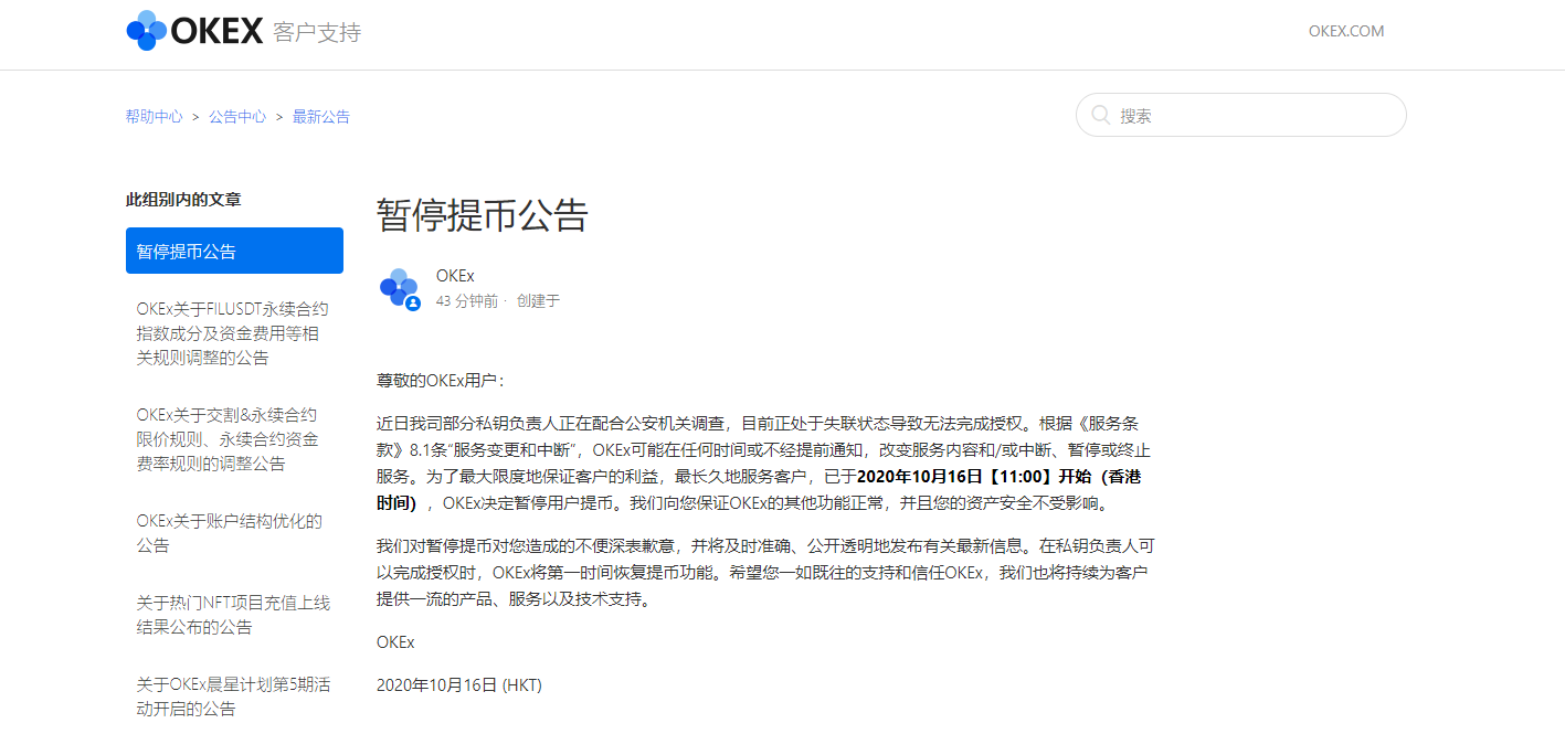 财联社10月16日讯,OKB虚拟币大跌逾16%。数字货币交易平台OKEx官网发布通知称,近日公司部分私钥负责人正在配合公安机关调查,目前正处于失联状态导致无法完成授权。为了最大限度地保证客户的利益,OKEx已于2020年10月16日11时,决定暂停用户提币。