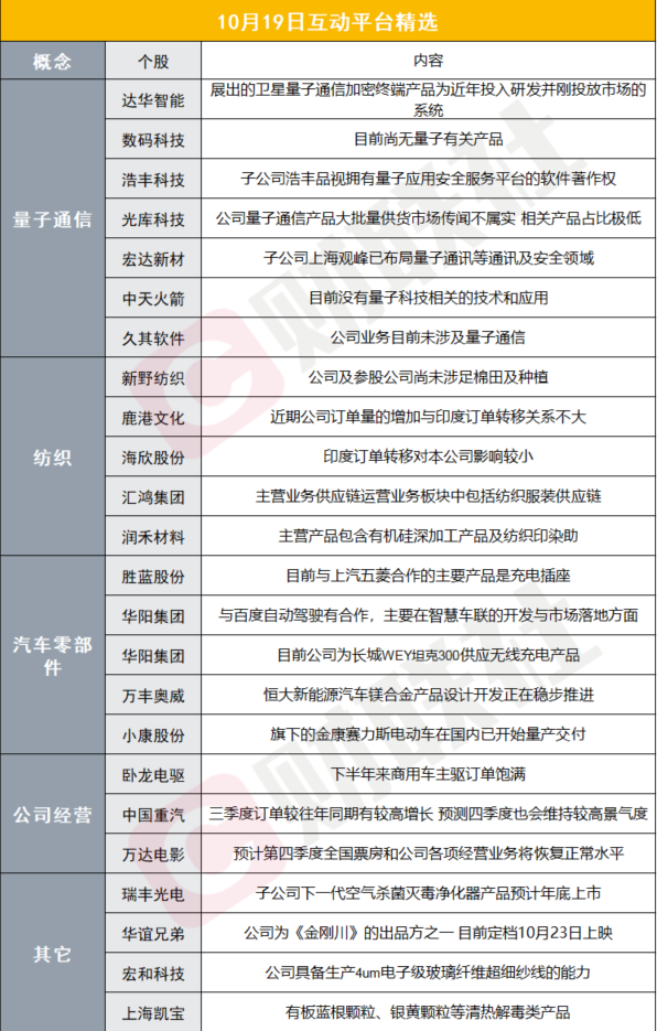 今日热门概念量子科技高开回落,军工股全天活跃,银行、农业等板块冲高回落,午后,有色、纺织、染料等板块小幅走强。互动平台上量子通信、纺织、汽车相关受关注,达华智能表示展出的卫星量子通信加密终端产品为近年投入研发并刚投放市场的系统;光库科技表示公司量子通信产品大批量供货市场传闻不属实,相关产品占比极低;宏达新材表示子公司上海观峰已布局量子通讯等通讯及安全领域;汇鸿集团表示主营业务供应链运营业务板块中包括纺织服装供应链;润禾材料表示主营产品包含有机硅深加工产品及纺织印染助;胜蓝股份表示目前与上汽五菱合作的主要产品是充电插座。