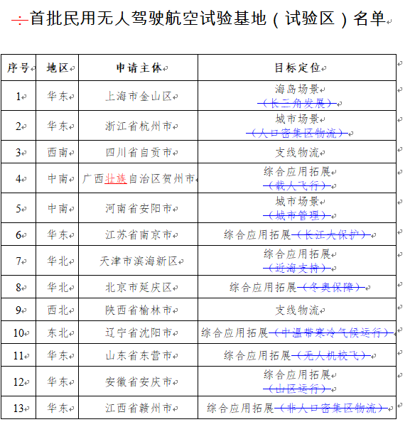 民航局公布首批民用无人驾驶航空试验基地