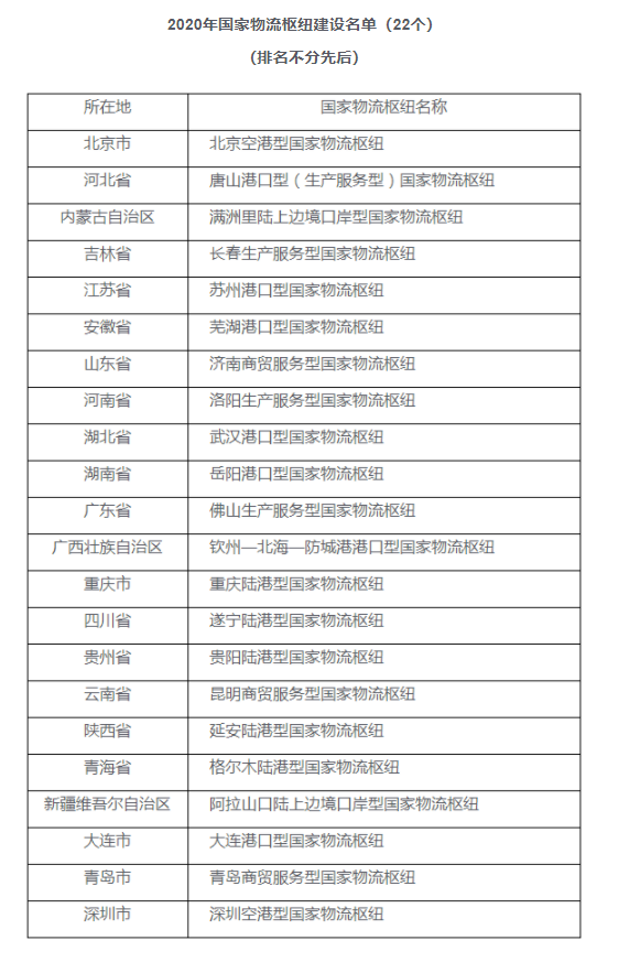 发改委、交通部发布2020年国家物流枢纽建设名单