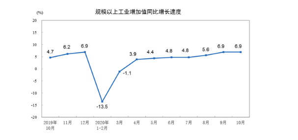 中国10月工业增加值同比增长6.9%