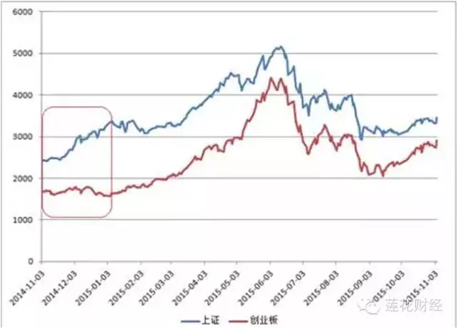 从本轮自2014年7月底启动的行情来看,大盘和创业板在绝大部分时间的走势是一致的。如图所示,两者在多数的情况下均属于同涨同跌走势,以6月中下旬以来的大调整为例,两者的低点时间完全吻合,高点出现的时间也一致,唯一的区别只是反弹的幅度差别而已。