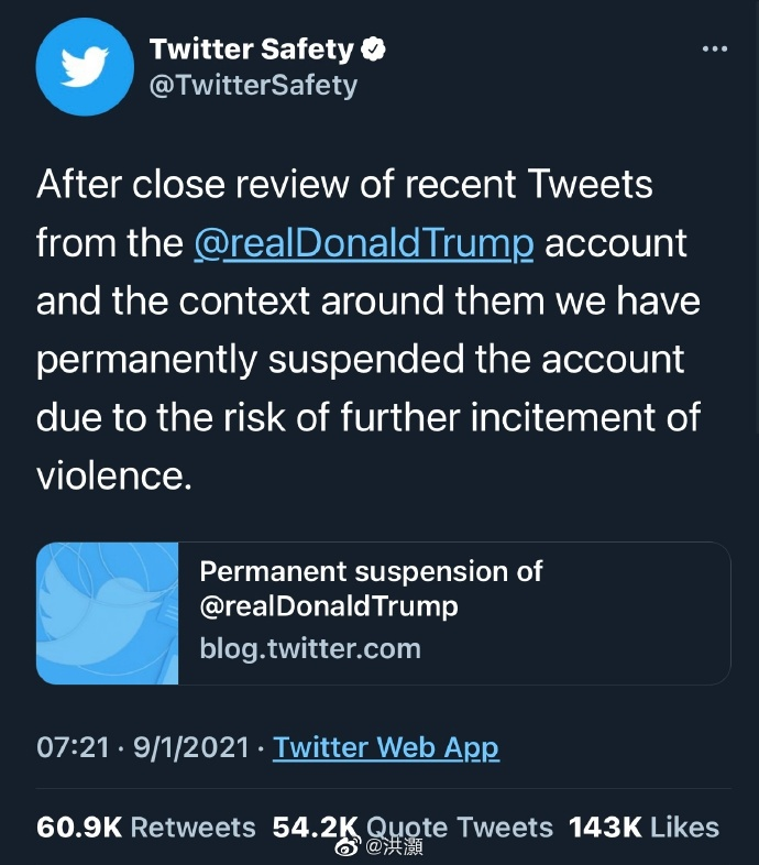 财联社1月9日讯,Twitter表示,在审查了特朗普总统的个人@realDonald Trump账户最近的推文后,该平台决定永久暂停该账户。推特称,这一决定是因为存在进一步煽动暴力的风险。