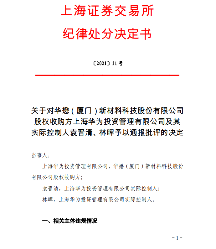 财联社3月2日讯,上交所发布关于对华懋(厦门)新材料科技股份有限公司股权收购方上海华为投资管理有限公司及其实际控制人袁晋清、林晖予以通报批评的决定。经查明,华懋(厦门)新材料科技股份有限公司股权收购方上海华为投资管理有限公司及其实际控制人袁晋清、林晖在信息披露方面存在权益变动报告书披露不及时,控制权受让主体前后不一致,未及时充分披露变动风险等违规行为。