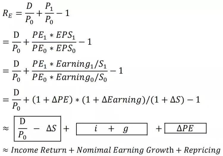 Grinold和Kroner(2002)提出单期股权收益供给模型:即股权收益拆解成三部分,分别是收入回报(Income Return)、名义盈利增长(Nomimal Earning Growth)和重新定价(Repricing),其中名义利润增长和重新定价组成资本回报。模型公式推导如下: