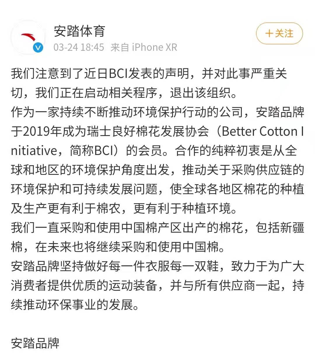 财联社3月24日讯,刚刚,安踏官方微博@安踏体育 发表声明称,注意到了近日BCI发表的声明,并对此事严重关切,我们正在启动相关程序,退出该组织。声明还称,安踏一直采购和使用中国棉产区出产的棉花,包括新疆棉,在未来也将继续采购和使用中国棉。