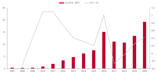 图表:2020年美国光伏新增装机19.22GW,同增42.5%