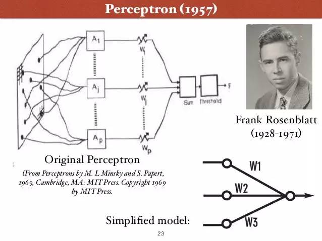 康内尔大学教授 Frank Rosenblatt 1957年提出的"感知器" (Perceptron),是第一个用算法来精确定义神经网络, 第一个具有自组织自学习能力的数学模型,是日后许多新的神经网络模型的始祖。