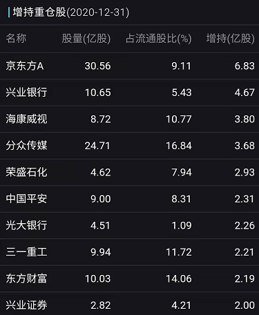 数据显示,截止2020年12月31日,基金增持重仓股前五名分别为京东方A、兴业银行、海康威视、分众传媒和荣盛石化,其中京东方A单季度增持6.83亿股,成为名副其实的基金头号增仓股。