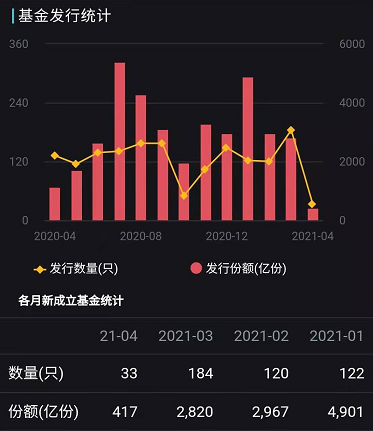尽管近期基金募集市场不佳,但2021年一季度新发基金数量却达到了10688亿份。数据显示,今年前3个月,分别为122只、120只和184只,发行份额分别为4901亿份、2967亿份和2820亿份。