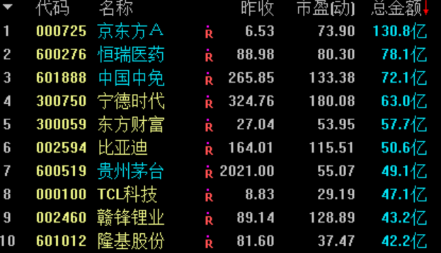 4月14日,4000亿的核心资产恒瑞医药跳水,成交量78.1亿元;5000亿的大白马中国中免“闪崩”次日强势反弹,当日成交量72.1亿元;而牢牢占据成交量榜首的却是京东方A——130.8亿元。