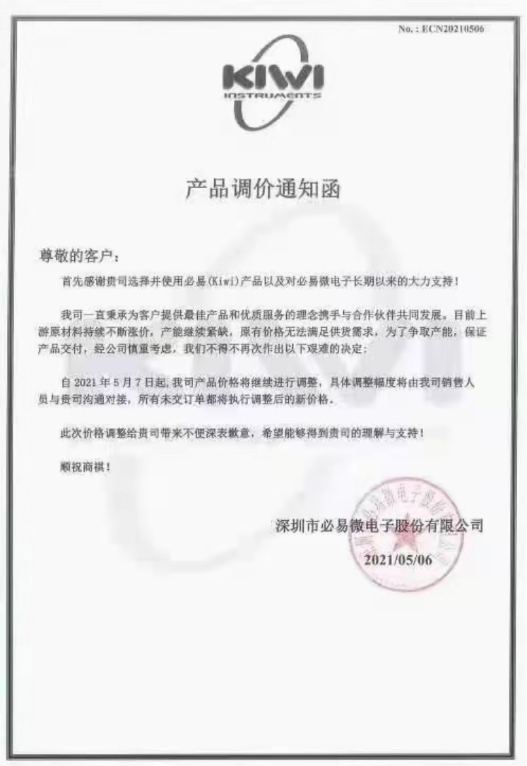 《科创板日报》7日讯,近日,国产电源芯片厂商必易微向客户发布产品调价通知函,称由于上游原材料持续不断涨价,产能继续紧缺,原有价格无法满足供货需求,决定自2021年5月7日起,产品价格将继续进行调整,具体调整幅度将由公司销售人员与客户沟通对接,所有未交订单将执行调整后的新价格。据悉,必易微去年12月就曾对旗下部分产品及其定制料号上调价格。此外,必易微科创板IPO申请此前已获上交所受理。 (集微网)