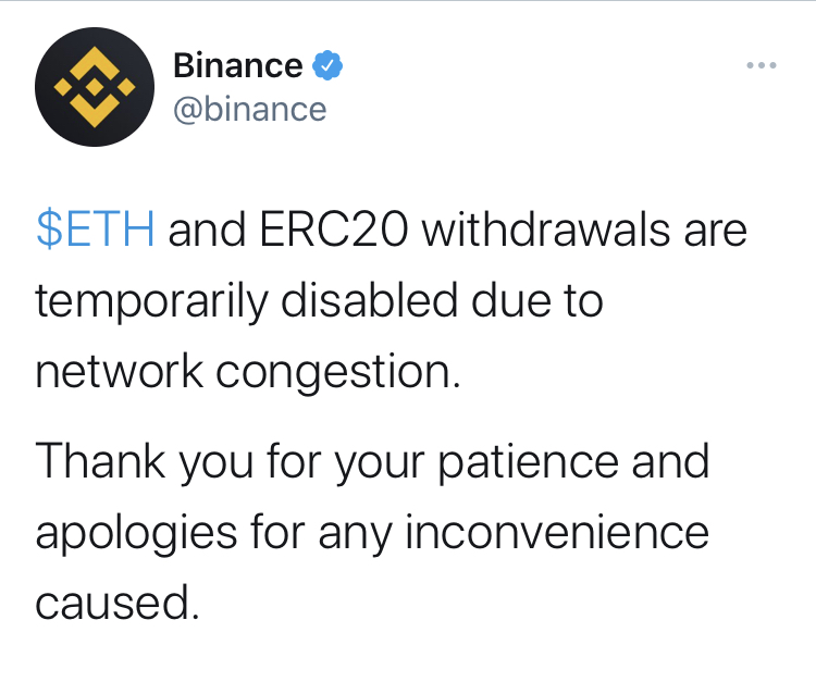 加密货币交易平台币安:暂停以太坊和ERC20的提款