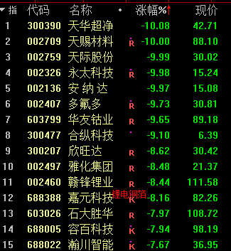财联社6月16日讯,锂电板块跌幅进一步扩大,天赐材料、华友钴业、天际股份等多只个股跌停,上游资源股雅化集团、赣锋锂业、西藏矿业、盛新锂能均跌超6%。