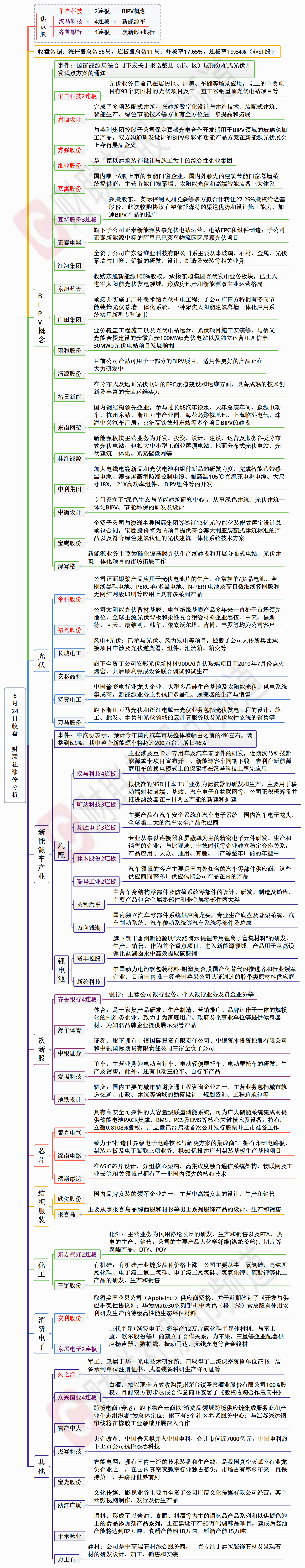 今日共56股涨停,连板股总数11只,12股封板未遂,封板率为82.35%(不含ST股、未开板新股)。其中,新能源车汉马科技录得4连板,白酒股众兴菌业录得4连板,次新银行股齐鲁银行收得4连板,BIPV概念华自科技录得2连板(创业板)、森特股份录得3连板。今日收涨个股1508只,收跌个股2693只。盘面上,光伏建筑一体化、装配式建筑、中船系等涨幅居前,鸿蒙概念、数字货币、钛白粉等跌幅居前。