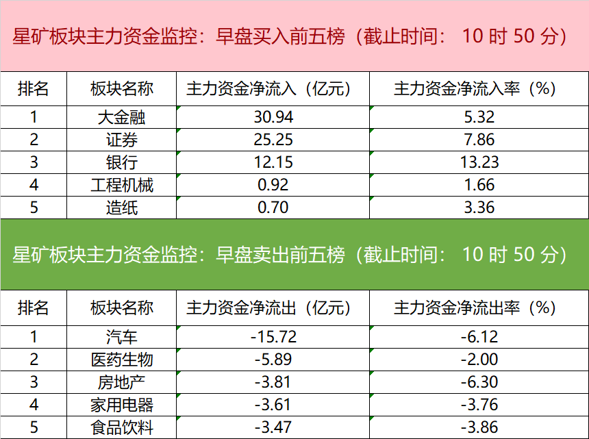 财联社星矿数据显示,今日早盘资金净流入明显增加,其中大金融、证券获资金净流入超25亿元;汽车、医药生物等板块出现5.8亿元以上的资金净流出。个股方面,东方财富、华天科技获净流入超10亿元;上海机场、比亚迪、士兰微等个股资金净流出超3亿元。