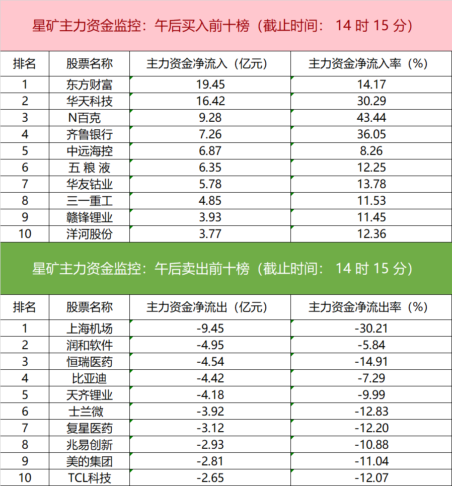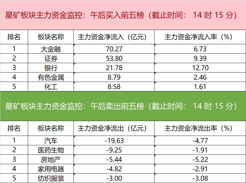 财联社星矿数据显示,今日资金净流入明显增加,其中大金融、证券获资金净流入超53亿元;汽车、医药生物等板块出现9亿元以上的资金净流出。个股方面,东方财富、华天科技获净流入超16亿元;上海机场、润和软件、恒瑞医药、比亚迪等个股资金净流出超4亿元。