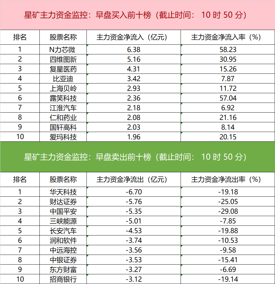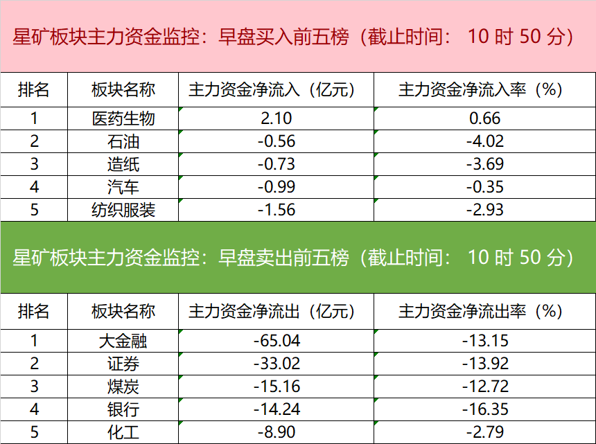 财联社星矿数据显示,今日早盘资金净流入明显减少,同时资金净流出量也急剧增加,仅医药生物获2.1亿元的资金净流入,其他板块均为资金净流出状态,其中大金融获资金净流出超65亿元,证券、煤炭、银行等板块均出现14亿元以上的资金净流出。个股方面,N力芯微、四维图新、复星医药获净流入超4.3亿元;华天科技、财达证券、中国平安、三峡能源等个股资金净流出超5亿元。