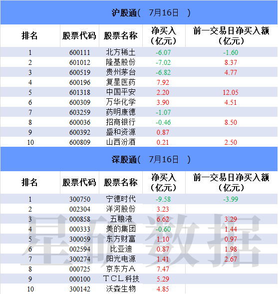 财联社7月16日讯,北向资金今日净流出41.44亿,本周合计净流入16.69亿元。宁德时代净卖出9.58亿,隆基股份净卖出7.02亿,贵州茅台净卖出6.82亿,北方稀土净卖出6.07亿。复星医药、五粮液、京东方分别净流入7.9亿元、6.62亿元、7.47亿元。