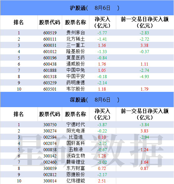 财联社8月6日讯,北向资金今日净卖出4.74亿元。贵州茅台、宁德时代、国轩高科分别获净卖出5.77亿元、3.87亿元、2.75亿元。亿纬锂能净买入额居首,金额为2.51亿元。本周北向资金累计净买入逾100亿元。