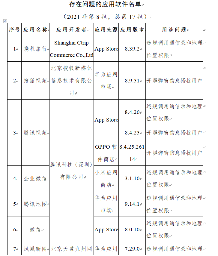 财联社8月18日电,工信部针对用户反映强烈的APP违规调用通信录、位置信息以及开屏弹窗骚扰用户等三方面突出问题,组织开展了“回头看”,共发现43款APP(详见附件)仍存在问题整改不彻底、技术手段对抗、同一问题在不同地域整改不一致的情况,其中包括微信、腾讯视频等。上述APP应在8月25日前完成整改,逾期不整改或整改不到位的,我部将依法依规进行处置。