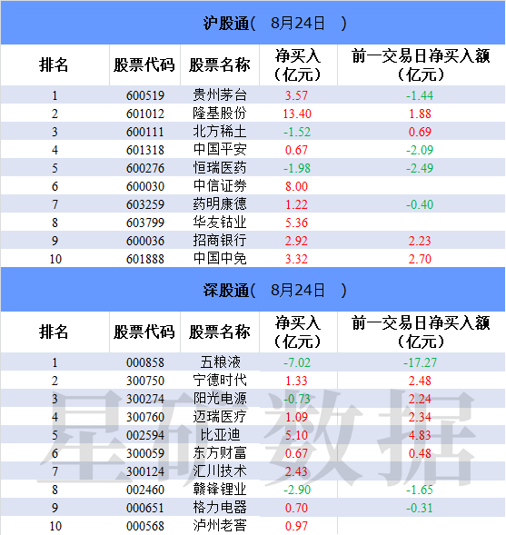 财联社8月24日电,北向资金今日大幅净买入53.15亿元。隆基股份、中信证券、华友钴业分别获净买入13.4亿元、8.0亿元、5.36亿元。五粮液净卖出额居首,金额为7.02亿元。