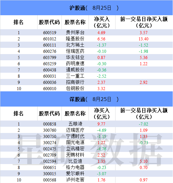财联社8月25日电,北向资金今日净买入34.19亿元。五粮液、隆基股份、贵州茅台分别获净买入9.77亿元、6.56亿元、4.69亿元。立讯精密净卖出额居首,金额为4.76亿元。