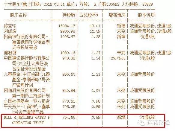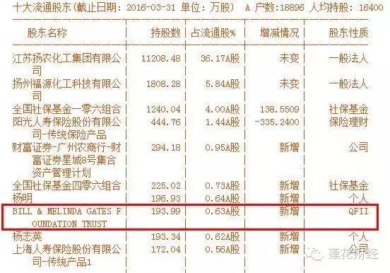 证券时报•莲花财经(ID:lianhuacaijing)小编根据数据统计发现,在已公布2016年一季报的上市公司中,华策影视、扬农化工的前十大流通股东名单中也出现了比尔盖茨基金的身影,均为一季度新进买入,分别持有508.1万股、193.99万股。有图为证: