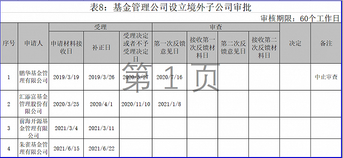 而证监会公布的本周《证券、基金经营机构行政许可申请受理及审核情况公示》显示,目前有汇添富、前海开源、朱雀三家基金公司递交了设立境外子公司的申请,处于待审批状态。其中,汇添富已于今年年初接到第一次反馈意见,前海开源、朱雀两家基金公司的申请目前处于材料补正状态。
