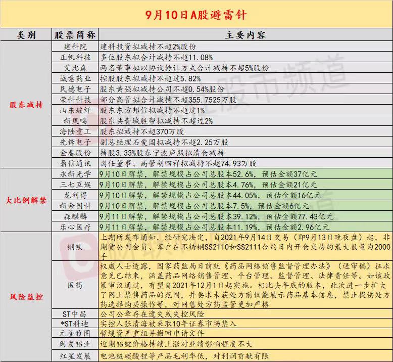 昨日A股拟减持规模较之前有所减少,其中正帆科技遭11.08%大比例减持,诚意药业控股股东拟减持不超过5.82%;龙利得、永新光学等个股将迎来超三成以上解禁。国家粮食和物资储备局组织投放国家储备原油;*ST科迪实控人张清海被釆取10年证券市场禁入;上期所对不锈钢品种部分合约实施交易限额;ST中昌公司公章存在遗失或失控风险;美股三大指数集体收跌 热门中概股涨跌不一。
