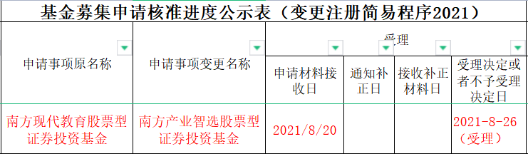 根据证监会官网披露的信息,8月20日,南方基金经理萧嘉倩管理的“南方现代教育”递交了申请变更为“南方产业智选”的材料,该申请于8月26日被受理。