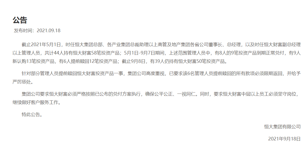 财联社9月18日电,恒大集团公告,针对部分管理人员提前赎回恒大财富投资产品一事,集团公司高度重视,已要求该6名管理人员提前赎回的所有款项必须限期返回,并给予严厉惩处。集团公司要求恒大财富必须严格按照已公布的兑付方案执行,确保公平公正、一视同仁。
