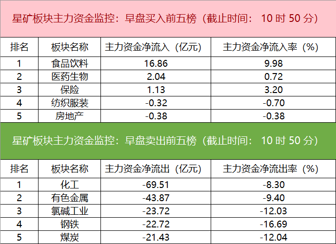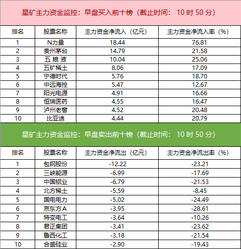 财联社星矿数据显示,今日早盘主力资金净流入食品饮料、医药生物、保险等板块,净流出化工、有色金属、氯碱工业等板块,其中净卖出化工板块超69亿元。个股方面,创业板新股N力量一度涨超12倍,主力资金净买入18.44亿元,贵州茅台、五粮液、五矿稀土获主力资金净流入居前;包钢股份遭净卖出超12亿元,三峡能源、中国铝业、北方稀土等主力资金净流出额居前。