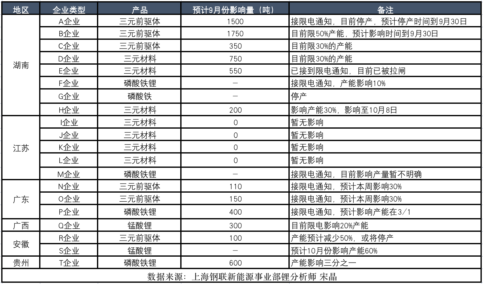 从上述列表可以看出,正极材料中,湖南为影响的“重灾区”,除了有企业被限至少10%产能以外,甚至有企业因限电通知而拉闸。其次则为广东,周影响产量均约在30%的幅度。