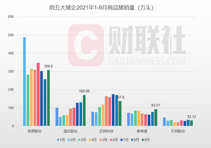 近日,前五大猪企已全部发布9月销售简报,除正邦科技(0002157,SZ)和天邦股份(002124,SZ)股份,其余三家出栏量环比显著增加。数据显示,牧原股份(002714,SZ)、温氏股份(300498,SZ)和新希望(000879,SZ)9月出栏量分别为308.6万头、169.88万头、93.57万头,环比增速依次为19.93%、29.62%、20.01%。正邦科技和天邦股份出栏量分别为137.6万头、32.12万头,环比下降分别为19.61%、9.09%。