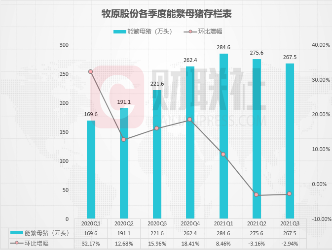 根据涌益咨询数据,9月能繁母猪母猪存栏量环比下降1.69%,其中大集团降幅0.93%,中小型养殖场母猪去化进一步加剧。根据牧原股份公布数据,2021年9月底,牧原股份能繁母猪存栏为267.5万头。自今年一季度以来,牧原能繁母猪增速明显放缓,公司能繁母猪数量已连续两个季度环比下降。