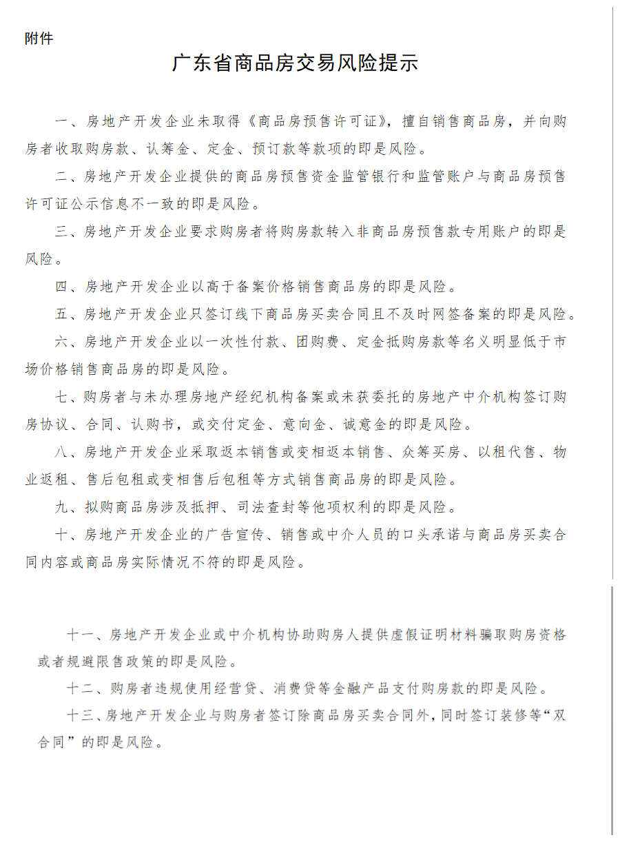 财联社10月13日电,广东省住房和城乡建设厅发布关于进一步做好商品房交易风险提示的通知。通知指出,房地产开发企业以高于备案价格销售商品房的即是风险。购房者违规使用经营贷、消费贷等金融产品支付购房款的即是风险。房地产开发企业以一次性付款、团购费、定金抵购房款等名义明显低于市场价格销售商品房的即是风险。