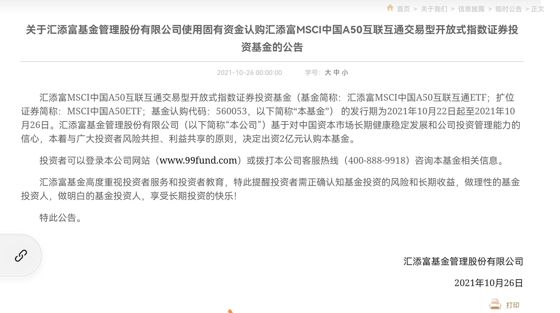 财联社10月26日讯,近期由汇添富基金推出的汇添富MSCI中国A50互联互通ETF正在发行中。10月26日,公司发布公告称,基于对中国资本市场长期健康稳定发展和公司投资管理能力的信心,本着与广大投资者风险共担、利益共享的原则,将出资2亿元认购该基金。